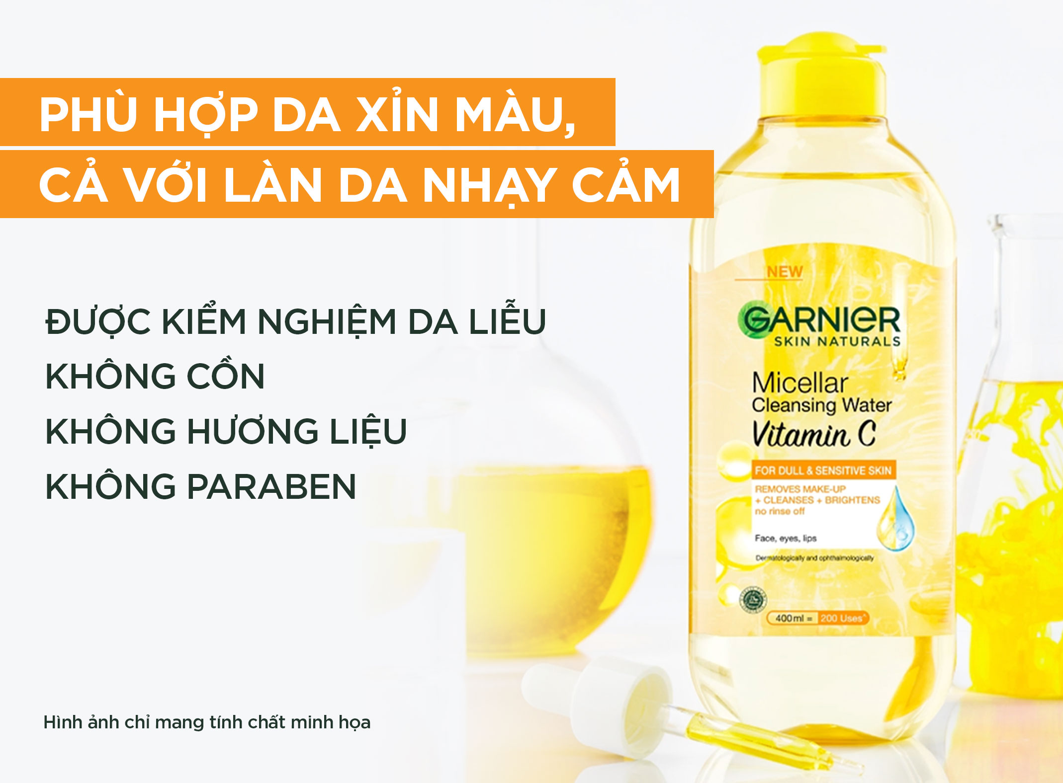 Nước làm sạch và tẩy trang đa năng Garnier Micellar Water Vitamin C 400ml làm sạch sâu và dưỡng sáng da với thành phần Vitamin C & chiết xuất quả Yuzu trong thiên nhiên.